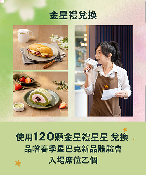 星禮程金星禮以金星兌換不同驚喜,你可使用120顆金星禮星星,兌換【品嚐春季星巴克新品體驗會】入場席位乙個。