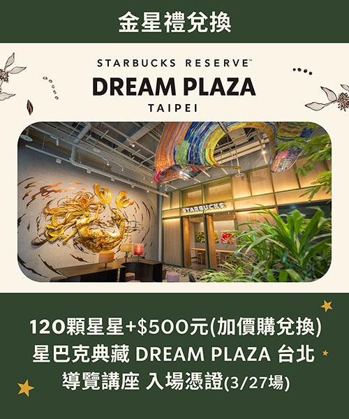 星禮程金星禮以星星兌換不同驚喜,你可以先在線上兌換導覽講座入場資格憑證後,於活動當日現場結帳參與費用,以120顆金星禮星星(線上兌換)+500元(活動當日結帳),兌換《星巴克典藏 DREAM PLAZA 台北 導覽講座》入場資格憑證。